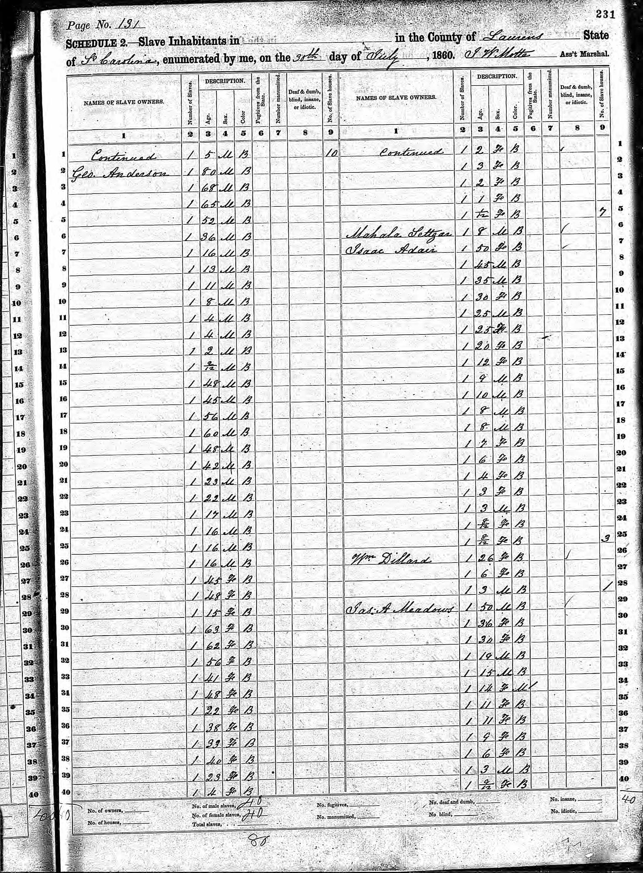 And here is what I believe is a U.S. slave schedule from 1860 that reveals Adair’s roots in Laurens County, S.C.: