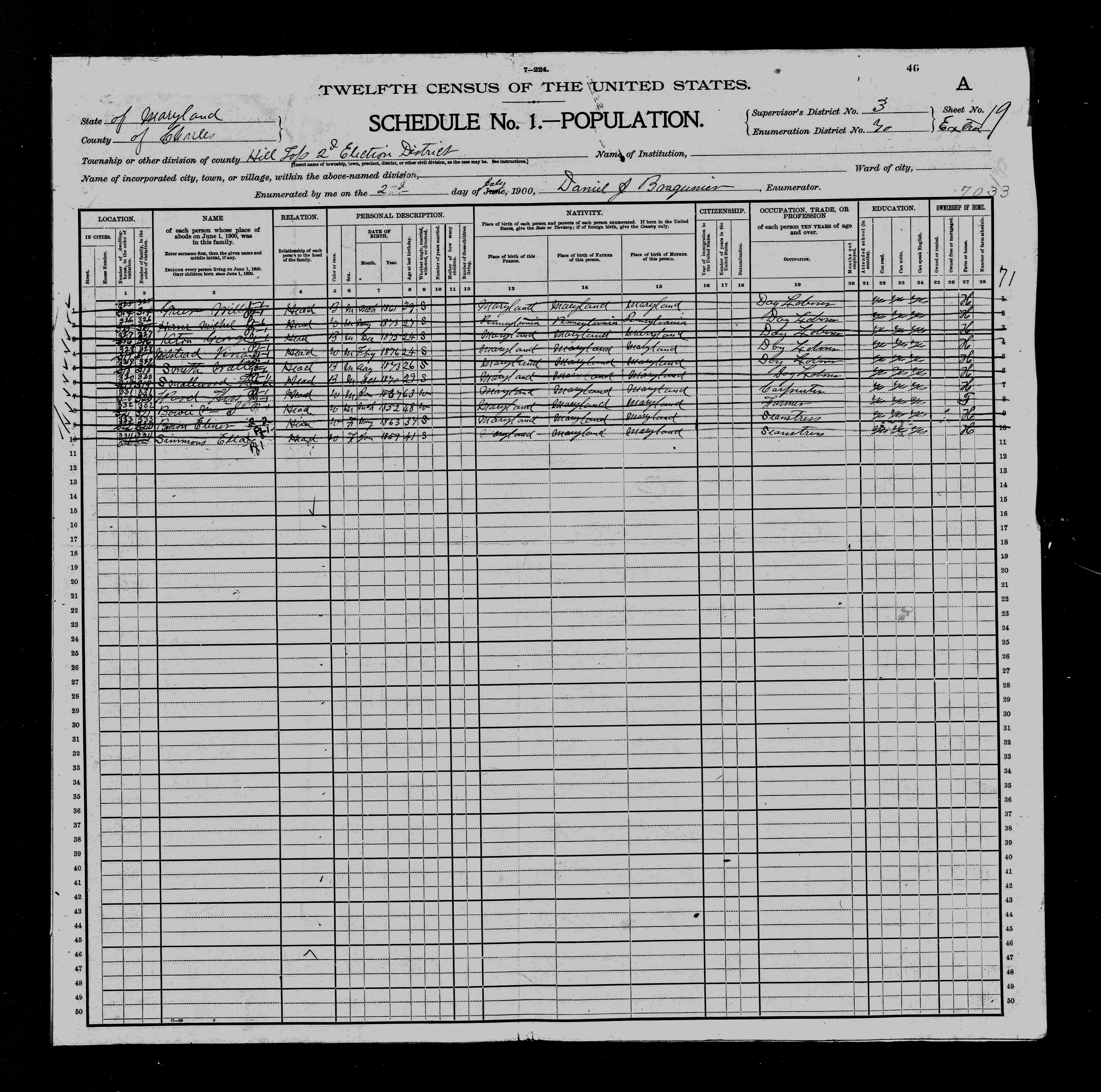 Frank turns up, sort of, in the 1900 Census in Charles County, Md., which neighbors Prince George County to the south. Frank is the 29-year-old (so, according to this, né about 1871) head of a one-person household. He’s listed as a “day laborer.”