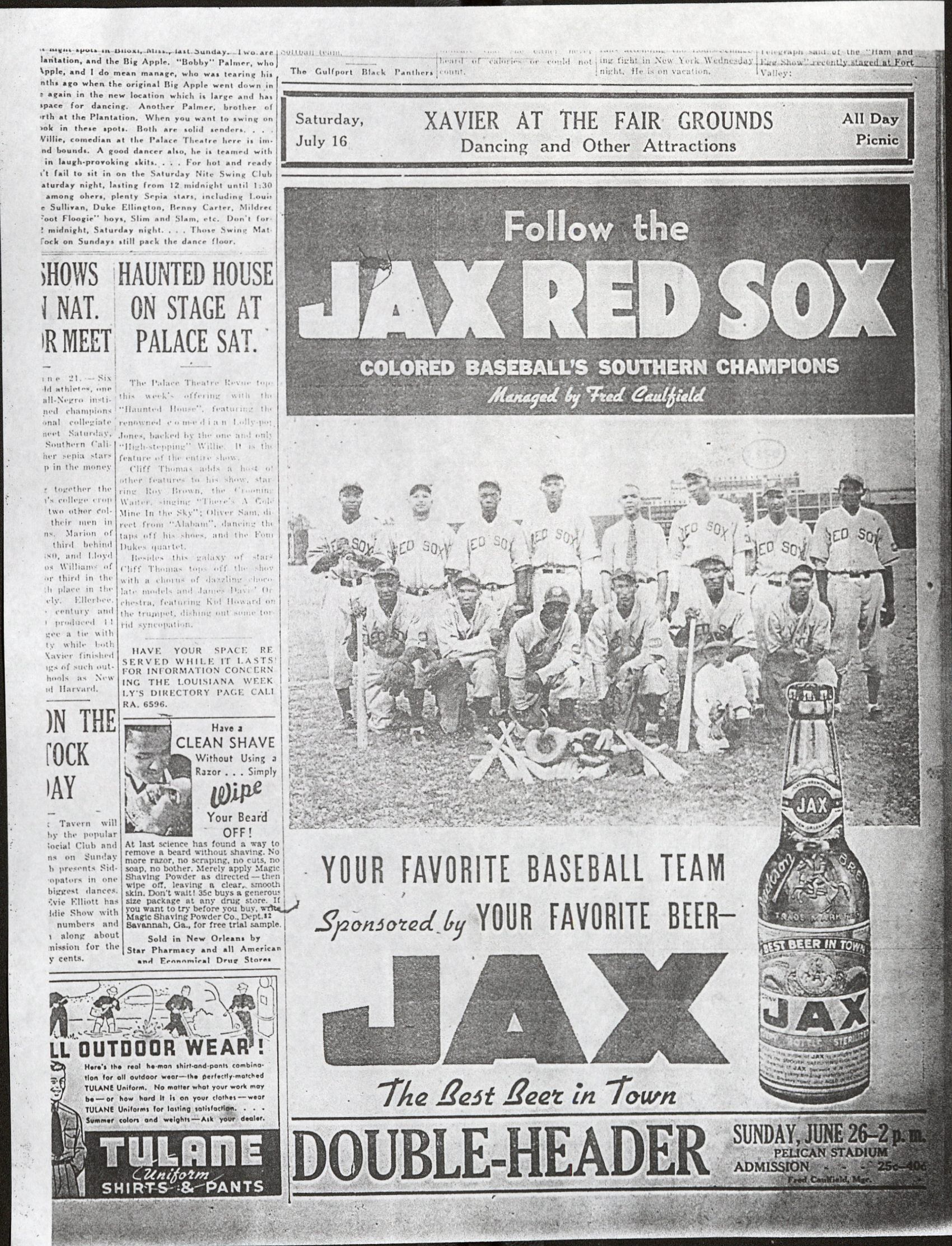 That year, Caulfield brought together and skippered the Jax Red Sox, a team sponsored by longtime and beloved Jax Brewery — the business has, however, long since been gone, and the brewery space is now a commercial/apartment complex — who, as evident in the Louisiana Weekly ad below, put forth “Colored Baseball’s Southern Champions.” The ad, umm, adds: “Your favorite baseball team sponsored by your favorite beer.”