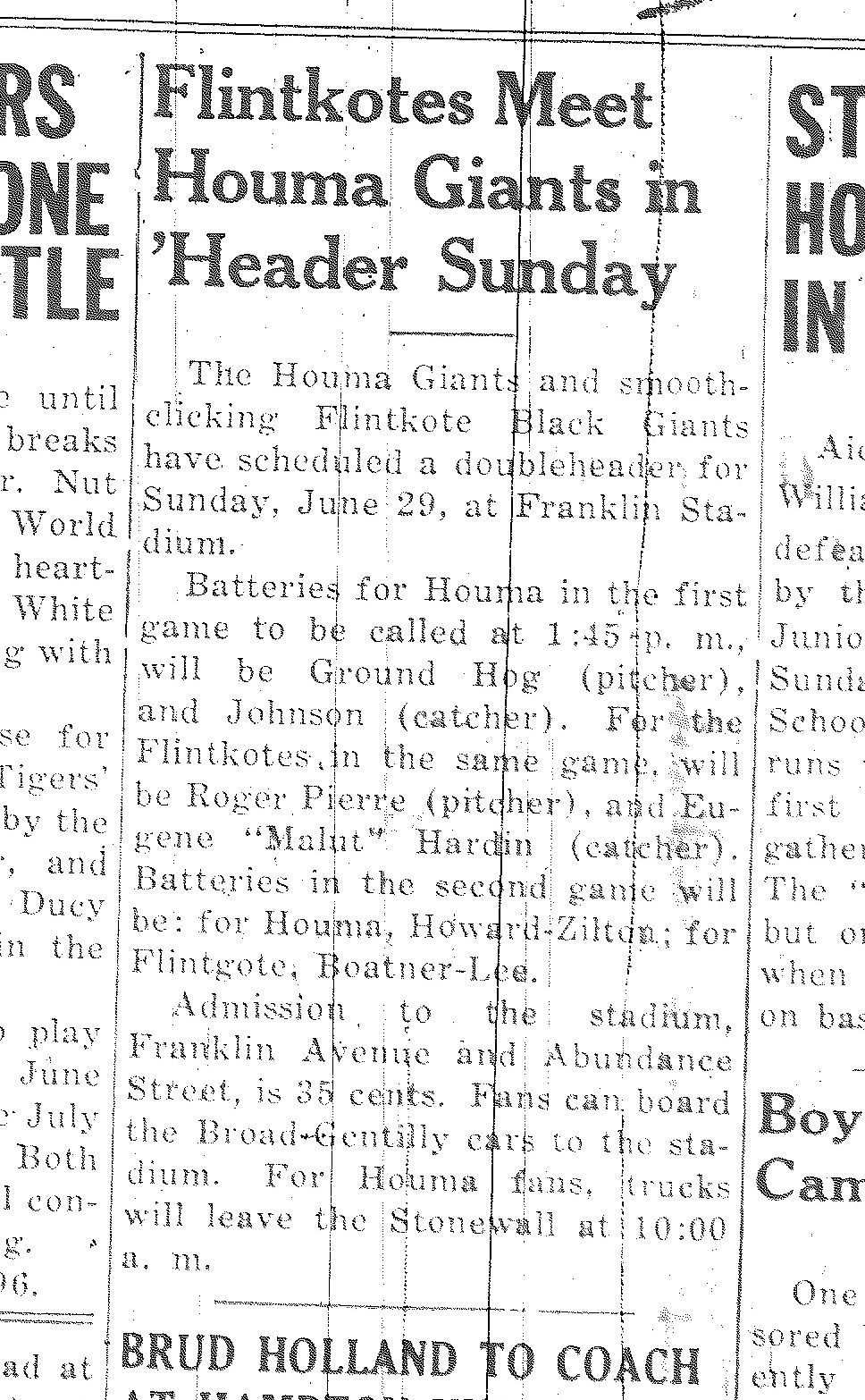 “In a spine-tingling mound duel Dan Boatner of the Flintkote Giants bested ‘Groundhog’ Thompson of the Houma Giants, in the first tilt of a doubleheader played by the two teams … ‘Mule’ Hardin’s big bat banged out the hit that gave Dan Boatner the edge in the first contest, when two men scored on his single through the box in the sixth frame.”