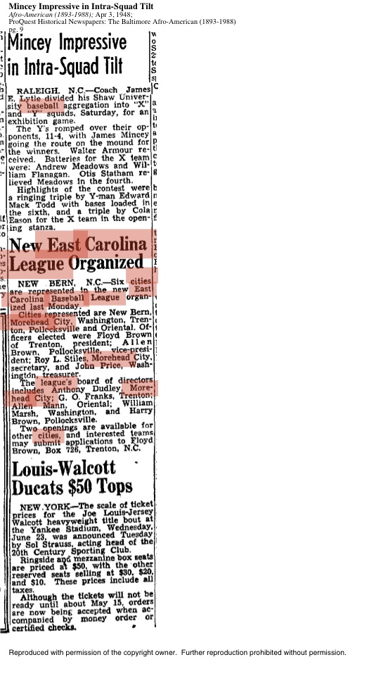 Baltimore’s manager merry-go-round didn’t stop there; in late January of ’48, Candy Jim Taylor, veteran pilot and part of blackball’s royal family, the Taylors, had been hired to bump out Snow. Jim Taylor had just been canned by the Chicago American Giants of the NAL after guiding that team for three years. In a January 1948 article in the Afro-American, Green was quoted as saying, “In any event, you can be sure we will be aiming to strengthen the club.”