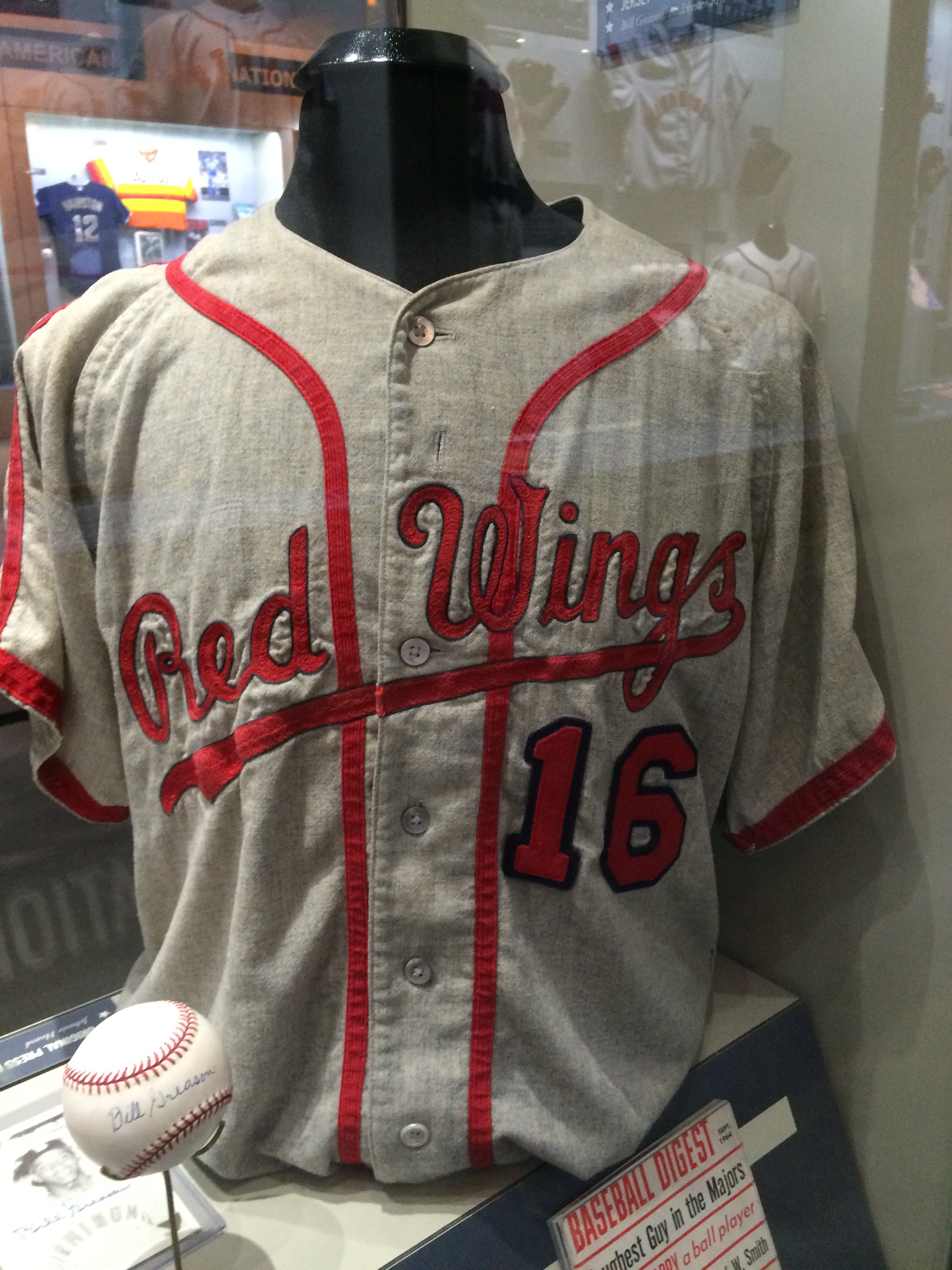OK, remember when I said the framed baseballs were my favorite aspect of the museum? Well, this is actually tied for the top slot — a game-worn, 1958 uniform from Bill Greason when he played for my hometown Rochester Red Wings!