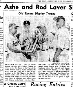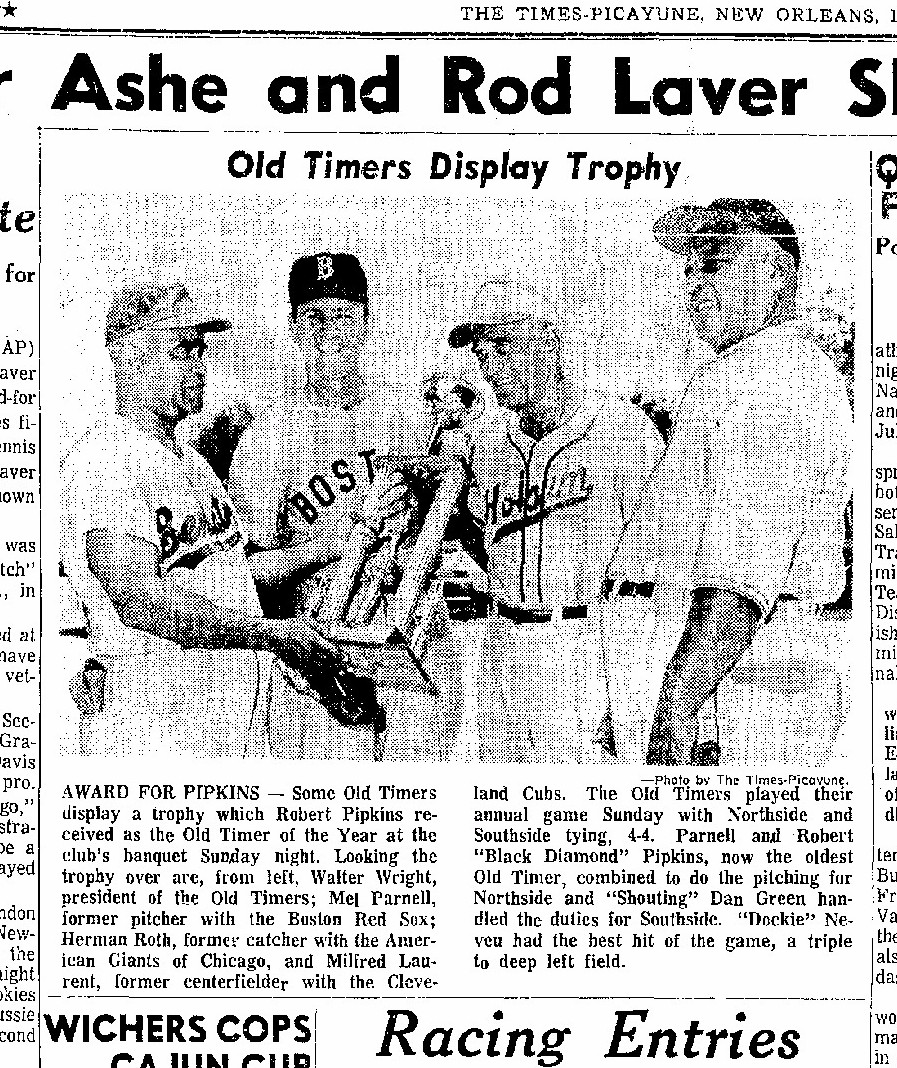 Thus, I was ecstatic when I found this picture and caption from the Times-Picayune in 1970, in which Pipkins receives an award from the Old Timers Baseball Club, a celebrated group of former NOLA Negro Leaguers who held an annual all-star reunion game and banquet. The caption for the picture states that Pipkins, at the time the oldest living member of the club, received the Old Timer of the Year Award: