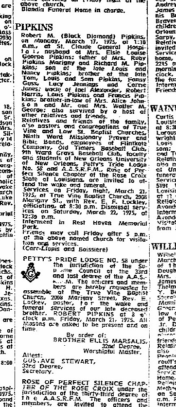 Also of significance in the obit is the note about Pipkins’ membership in the local Masons and the scheduling of a memorial service by the organization. The note is signed by Worshipful Master Ellis Marsalis, which is quite intriguing because, if it’s the same guy, Ellis Marsalis was the patriarch of the famous Marsalis jazz musicians, including modern-day luminaries like Wynton and Branford.