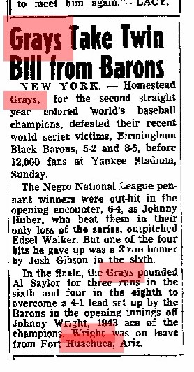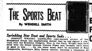 “Johnny Wright, gangling right-handed pitcher of the Homestead Grays, has emphatically denied that he has signed a contract with the Brooklyn Dodgers. Now in the Navy, Wright says he’ll stick with the Grays because Owners Posey and Jackson have been so good to him.”