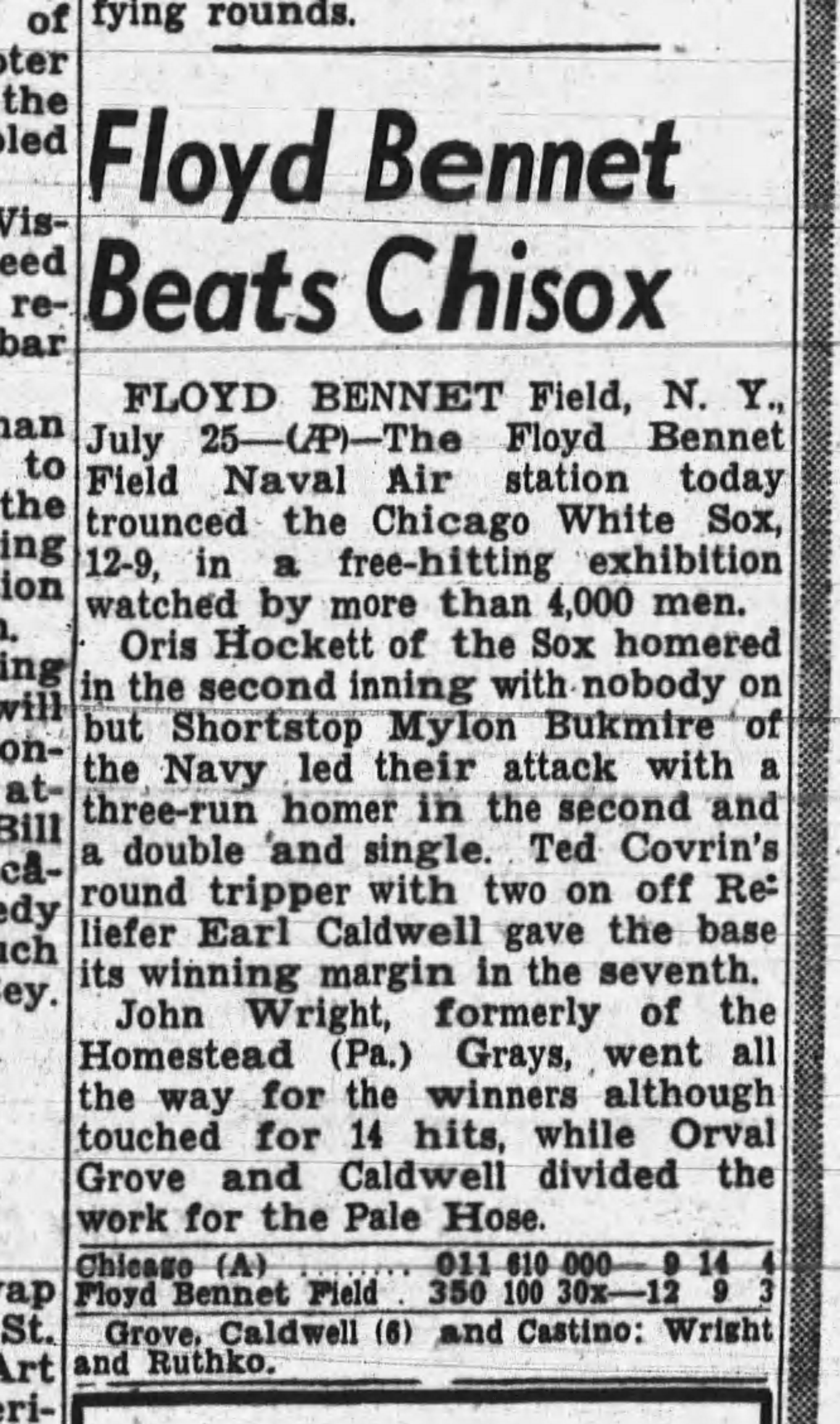 However, things got even murkier when I found this wire service article in the July 26, 1945, issue of the Richmond (Ind.) Palladium-Item about the Fort Bennett Naval Field team in Brooklyn, N.Y., edging out the Chicago White Sox in an exhibition. Check out the reported pitcher for the New York sailors: