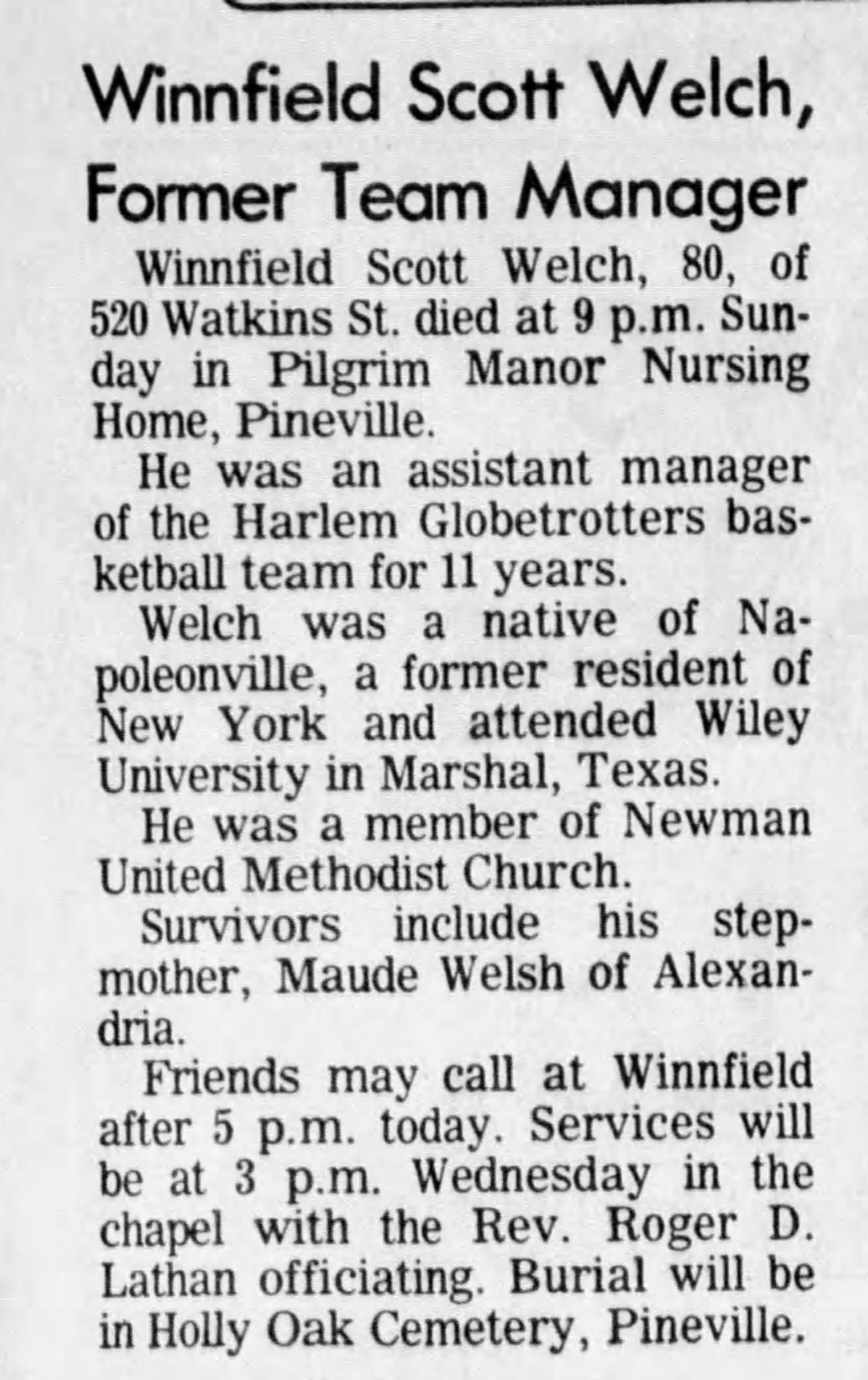 Alas and quite fortunately, I at long last turned up an obituary for Welch in the Alexandria Town Talk from March 4, 1980 (Alexandria and Pineville are both located in Rapides Parish):