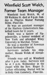 OK, on to the second find of the last couple weeks for me … In the past, I’ve written several blog posts (such as here and here) and an article about Winfield Welch, a native of tiny Napoleonville, La., who went on to an illustrious semipro and pro career with a slew of New Orleans teams before winning two NAL pennants with the Birmingham Black Barons in 1943-44 and eventually piloting barnstorming teams for promoter Abe Saperstein.