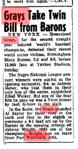 Fortunately, a reader, Richard Tourangeau, did notice that discrepancy, and he thankfully emailed me and pointed it out. So I went through some of the newspaper articles I’d pulled up from online archives about Wright during the war, and, lo and behold, I found a story in the Oct. 7, 1944, issue of the Baltimore Afro-American that says Wright was given a leave to pitch for the Homesteaders in a doubleheader against the Black Barons: