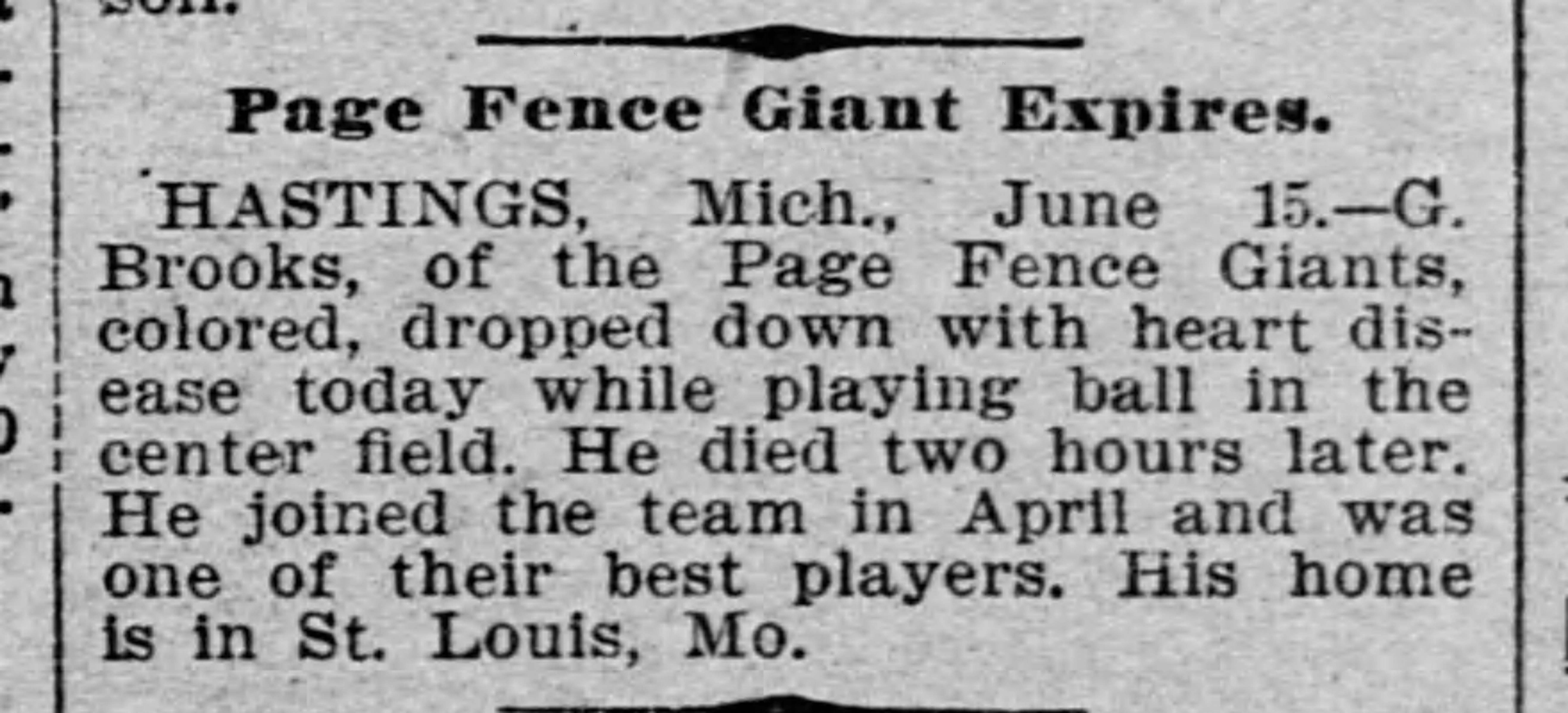 “G. Brooks, of the Page Fence Giants, colored, dropped down with heart disease to-day while playing ball in the center field. He was taken to the hotel, where he died two hours later. He joined the team in April and was one of their best players. His home is in St. Louis, Mo., where he has a grandmother living and is supposed to have no other near relatives. After his removal another man was substituted, and a hotly contested game was finished. The Hastings team was strengthened by players from other clubs, Miller, the Nashville pitcher going late into the box.”
