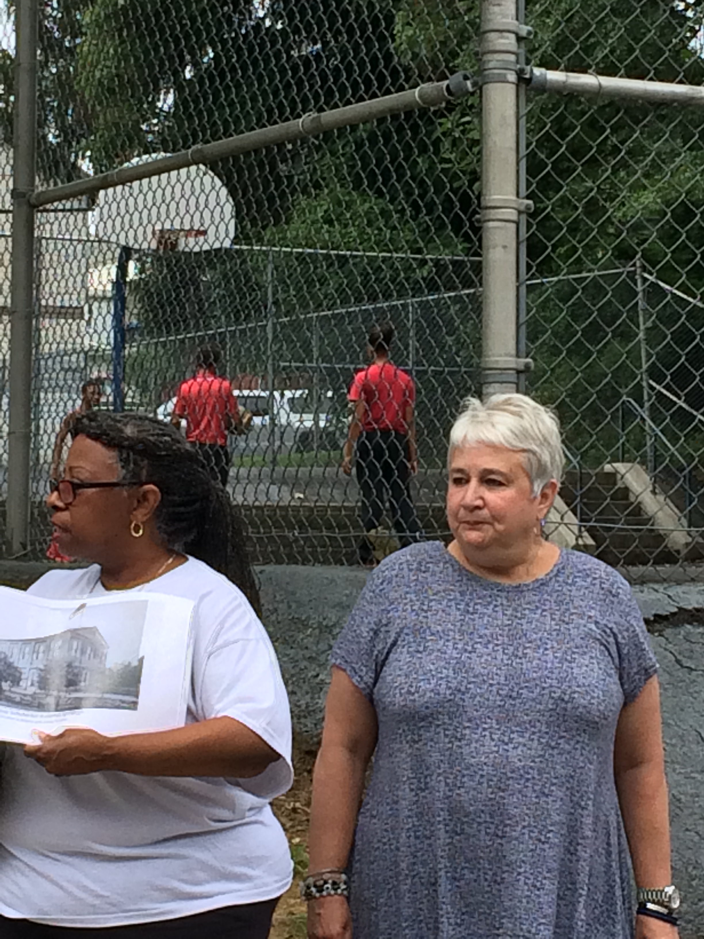 Community activist Barbara Barksdale filling the tour crowd in about the Hygienic School, the school Rap attended as a youth as Mayor Marcinko listens in. In the background, local kids play to-on-two on the court that sits where the school used to stand.