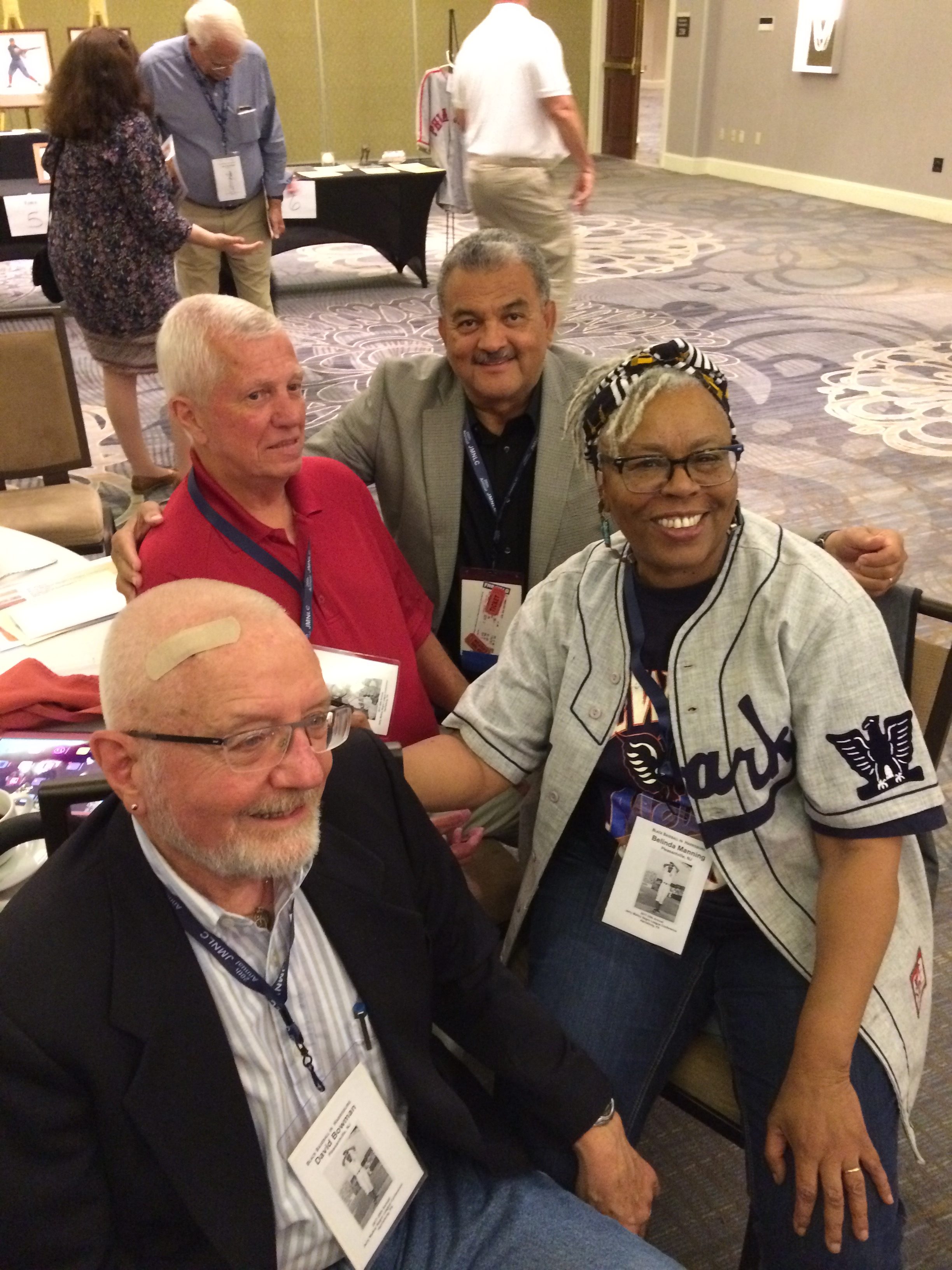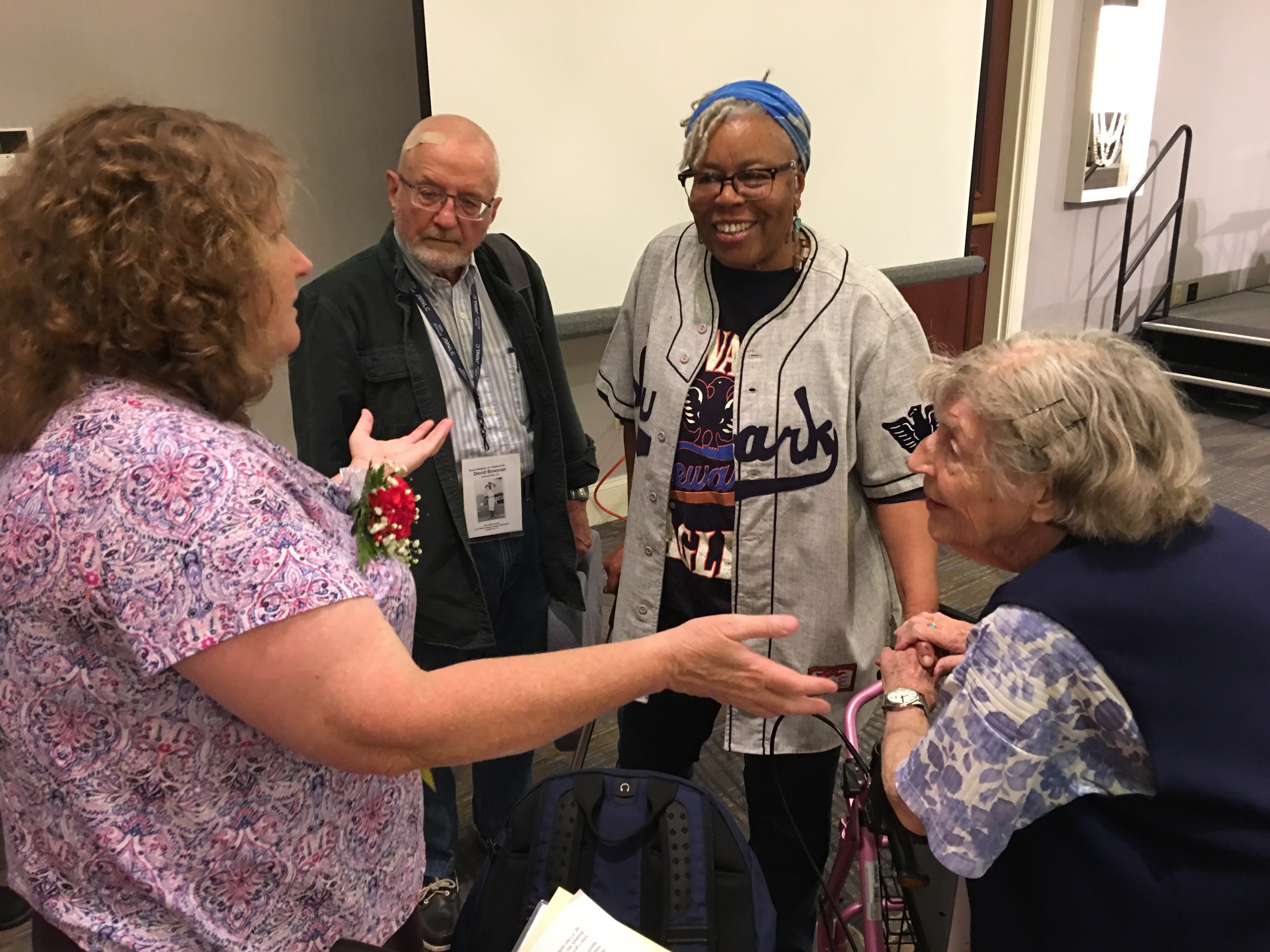 Margie Peterson (far left) and Peggy Peterson (far right) talk with David Bowman and Belinda Manning (daughter of Newark pitcher Max Manning) talk about Robert Peterson‘s landmark book, “Only the Ball Was White,” after listening to a recording of Robert’s stirring address at the very first Malloy Conference 20 years ago. Here is a passionate essay by Larry Lester describing the influence of the book on Larry and his work.