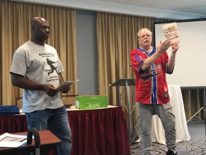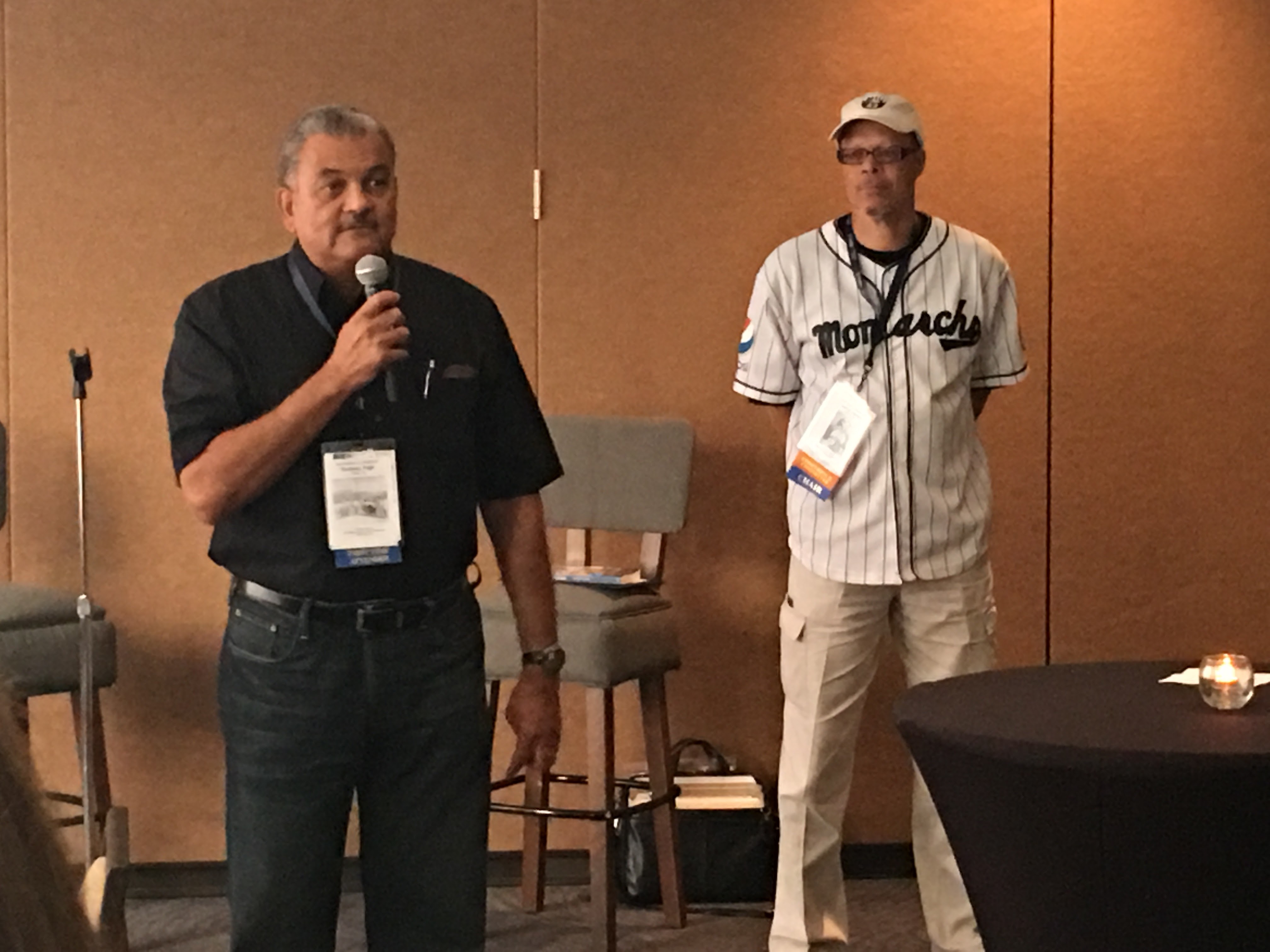 Floyd Stokes (left) and Ted Knorr (Harrisburg kid and my annual Malloy roomie, along with Lou Hunsinger Jr.) present their children’s Negro Leagues activity book at the conference’s education forum.