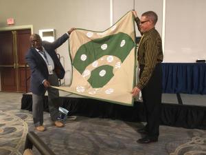Derrick Jones (left) presents a surprised Larry Lester with a beautiful, hand sewn, Negro Leagues-themed quilt for Larry’s years of dedication and efforts.
