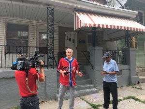 Ted speaking in front of Rap Dixon’s home while a TV fellow films him and Calobe looks on.