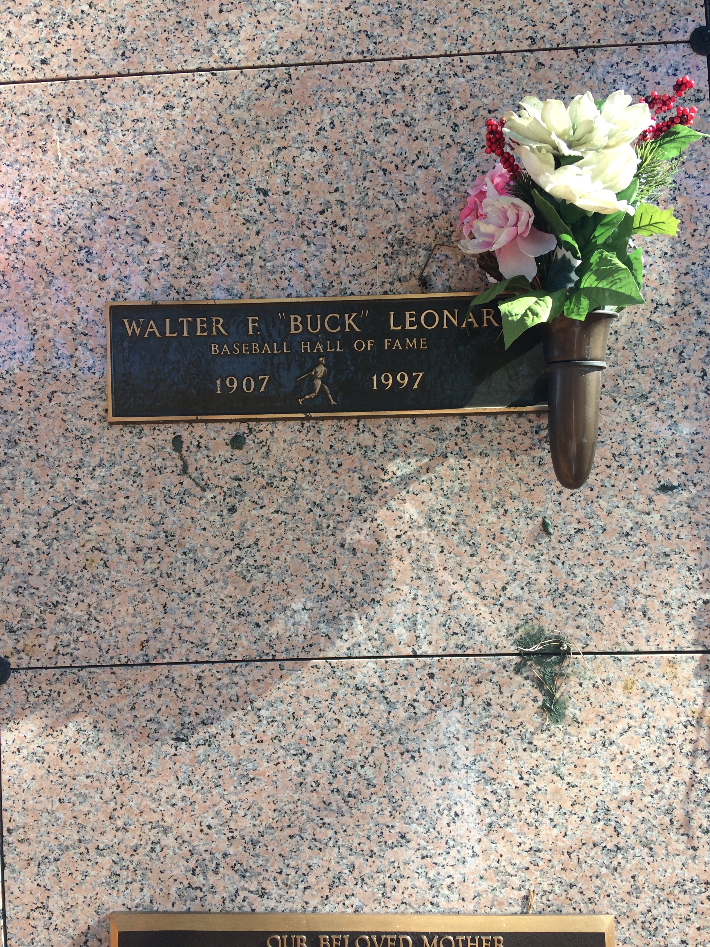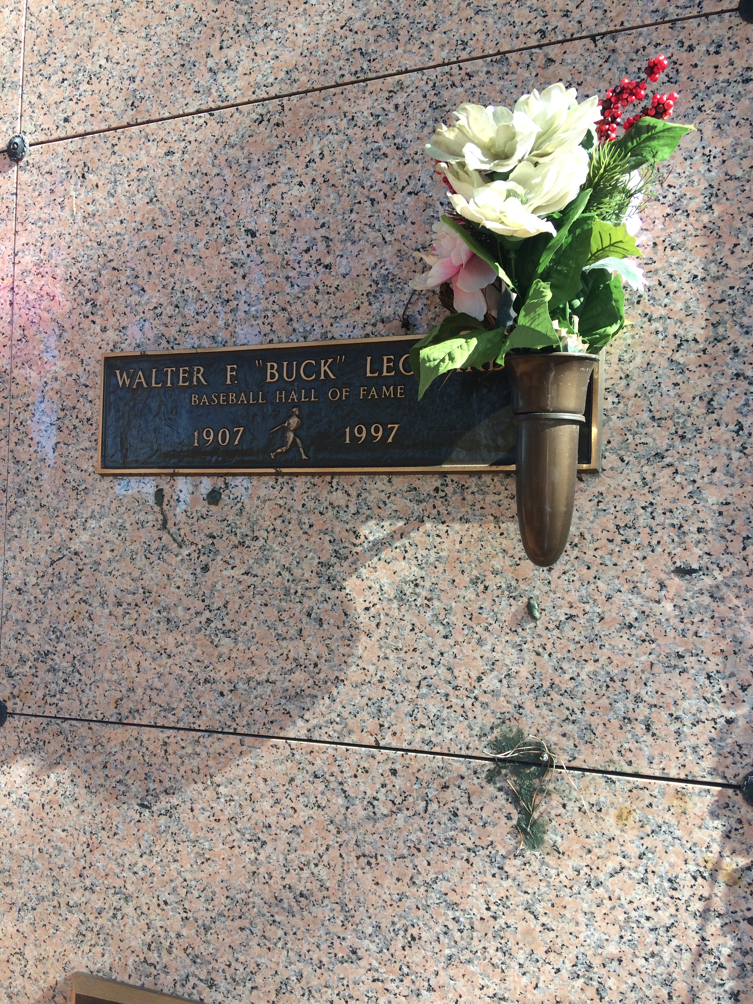 Buck’s crypt features a rectangular bronze plaque reading, “Walter F. ‘Buck’ Leonard, Baseball Hall of Fame, 1907-1997.” A little relief of a swinging baseball player separates his years of birth and death. Affixed to the right side of the plaque is a little vase holding white, red and pink artificial flowers; the floral arrangement, on this day, casts a shadow on the name plaque (which, at the very least, made it a bit challenging to get a decent picture of the grave).