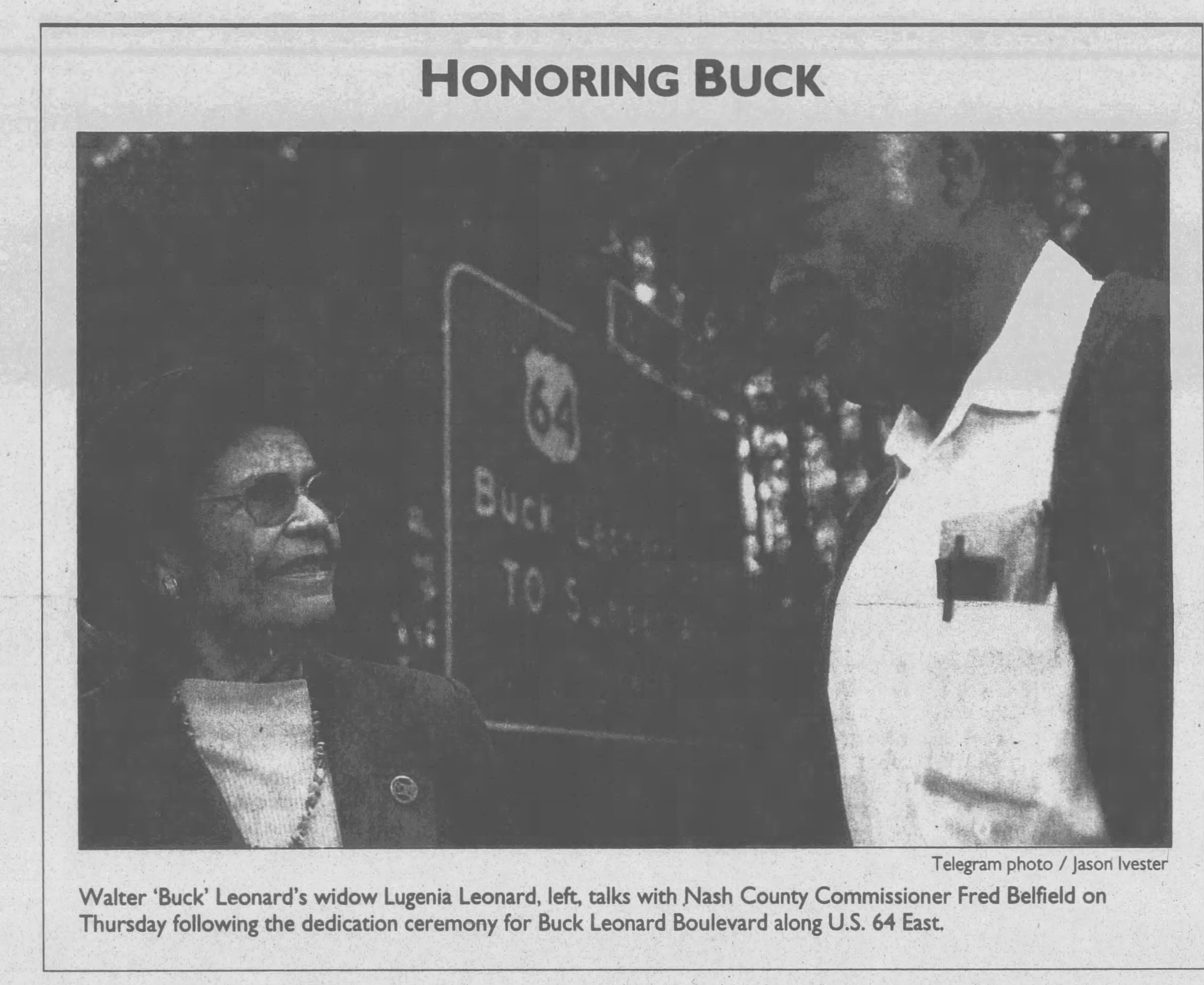 In June 2004, roughly seven years after Buck Leonard’s death, the Rocky Mount City Council passed a resolution calling for the North Carolina Department of Transportation to rename Ramp Road — a portion of U.S. 64 Business between the U.S. 64 Bypass, which runs east-west through Rocky Mount, to Sunset Avenue — Buck Leonard Boulevard. The DOT approved the alteration at its Sept. 2, 2004, meeting to restyle a fairly significant local thoroughfare into permanent memorial to the baseball legend.