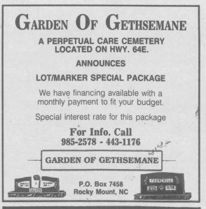 (The perpetual-care, privately owned cemetery is actually a fairly new one — it was created in 1991 despite some grumblings from adjacent property owners who worried that groundwater from the graves would contaminate the neighbors’ drinking water. Then-Edgecombe County Board of Commissioners Chairman Rev. J.O. Thorne endorsed the proposal, and landscape contractor A.B. Rose called it “a good project, and I think it’s going to be a good asset to the community.” Actually, it seems like the cemetery was initially supposed to be much bigger than it turned out, from a proposed 10,000 graves down to roughly 2,400, with wetlands issues playing a role. I write about these picky details out of nostalgia from my early days as a journalist in small-town North Carolina, covering planning boards and county commission meetings. It seems like a whole lot of drudgery, and it was in some ways. But it was also kind of fun and compelling getting to see how government works on a small scale. And by and large, local governmental systems — especially in small-town America, work much more smoothly and with a minimum of acrimony, certainly compared to what we see in D.C. It was surprisingly reassuring. That doesn’t mean things were completely devoid of controversy, personal grudges and administrative volatility; that stuff was there, no doubt. But municipal and county-level government tends to be much more responsive and attentive to the needs and concerns of the populace, which is pretty cool.)