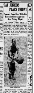 “Leading the brilliant array of colored stars will be Clarence Fat [sic] Jenkins [who] is well known to many Tremont fans as one of the greatest basketball players in the history of the cage game. ‘Fats’ manages the club and plays in the outfield. …