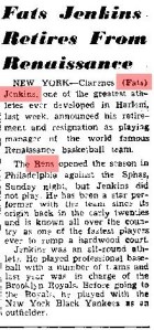“‘Fats’’ popularity with the fans and his team was due also to the fact that he encouraged the younger ball players. When he learned that his legs could no longer keep up their dazzling pace, Jenkins took time out to train younger players to fill his shoes, which is one reason why the Rens have managed through the years to remain ‘tops.’