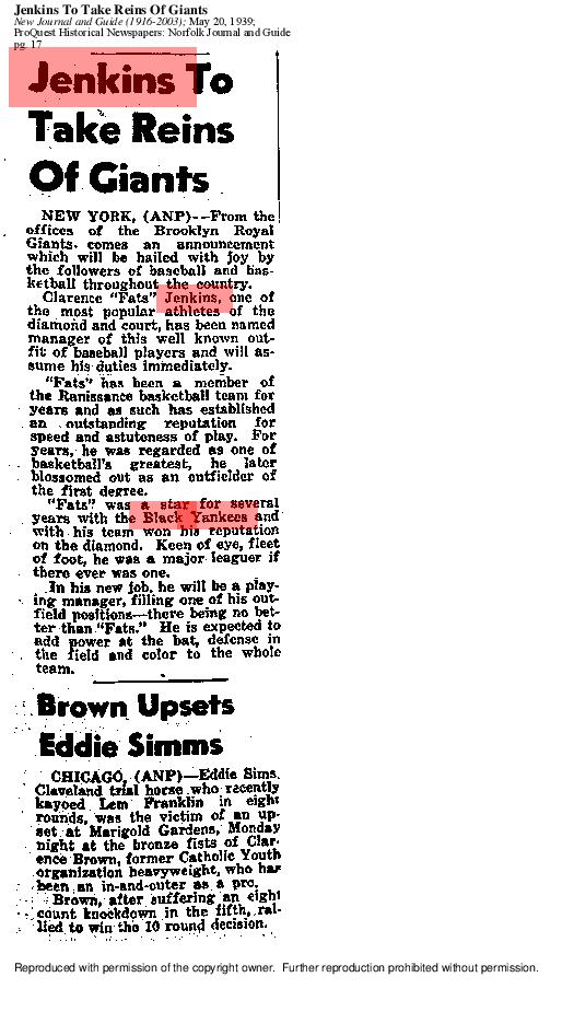 “Clarence ‘Fats’ Jenkins is manager of the [Royal Giants] and is considered one of the smartest men in Negro baseball ranks. ‘Fats’ Jenkins has worked very hard this spring to gather together what he thinks will be the best ball club that has represented the Giants for quite some time. In addition to playing one of the outfield posts, ‘Fats’ was considered as one of the outstanding basketball players of all times. He captained and played with the World’s professional champions, the Renaissance Big Five … ‘Fats’ has the widest acquaintance of an Negro player in the country.”