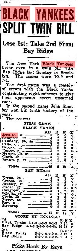 Moreover, by late summer Jenkins got fed up with the struggling Yanks and what he viewed as Semler’s penny-pinching, reportedly taking up shop with the Black Senators in August ’38. Later in August, the Afro-American reported that Jenkins had now joined the Crawfords, “having ditched the Black Yankees because of salary differences.”
