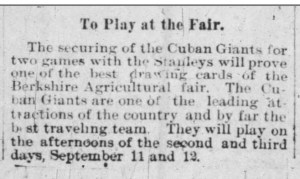 The Cuban Giants’ meetings with the Stanleys were fairly well covered by the local press, such as The Berkshire County Eagle of Pittsfield, The Pittsfield Sun and The North Adams Transcript. The clashes even got a paragraph in the Springfield Republican now and again.