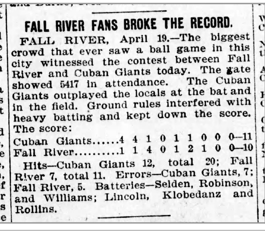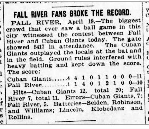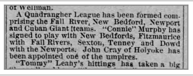 And not only did this “quadrangle” circuit sprout up, but one of the four teams in the league was the Cuban Giants. So along with the pro teams from Fall River; New Bedford, Mass.; and Newport, the four-team loop had a trailblazing, barnstorming, African-American aggregation. (As noted earlier, Fall River and New Bedford had been members of the New England League.)