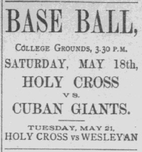 A little under two weeks after that, the Globe reported on one of the Cuban Giants’ triumphs over Wesleyan, and two short box scores below that, the paper announced an impending Holy Cross contest against Hahvahd. Then, on June 2, the Globe noted the Crusaders’ loss to Yale, exactly adjacent to a short report on another Cubans victory over UVM.