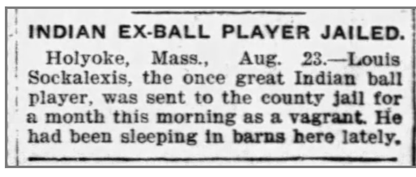 As an aside that tenuously connects Louis Sockalexis with my personal history, Sock — who spent several of his post-MLB career as a baseball vagabond, bouncing and careening and hoboing through the Northeast, playing for teams of all levels and invariably getting kicked off each one, usually because of his alcoholism — himself made a stop or two in Holyoke, where I lived and worked for two years. Unfortunately, at least one of those visits did not exactly go well — in August 1900, he was arrested for vagrancy at spent 30 days in the Holyoke clink. In the ensuing years there were reports that Sockalexis was seeking a spot on a team in Holyoke, but by then he was physically wrecked and psychologically crushed.