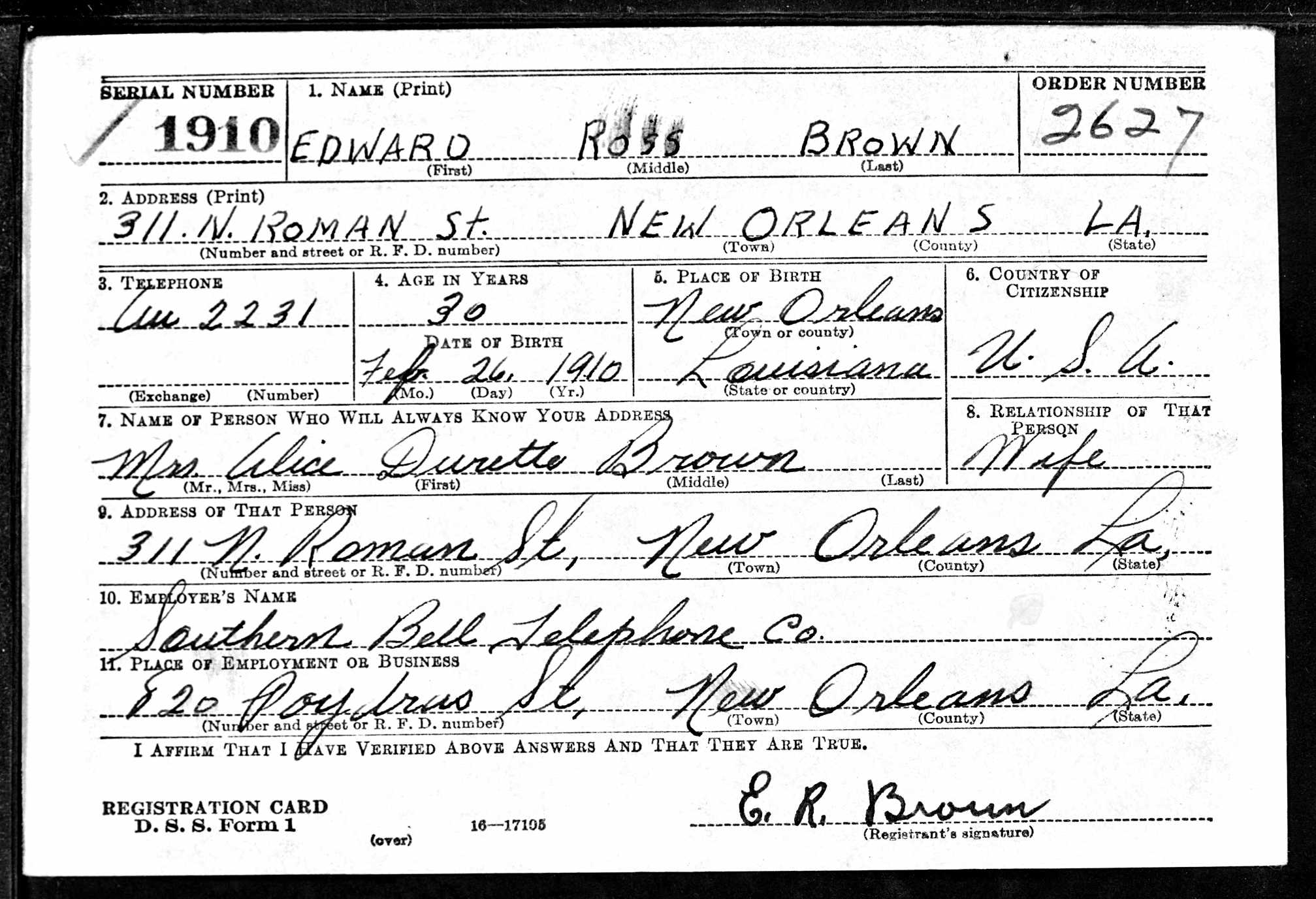 Official government documents state that Eddie Brown Sr. worked at a variety of jobs; the 1930 federal Census reported him as a porter at a lunch stand, while the 1940 Census lists him as a painter at a private address. His World War II draft card states that he was employed at Southern Bell Telephone Co. on Poydras Street.
