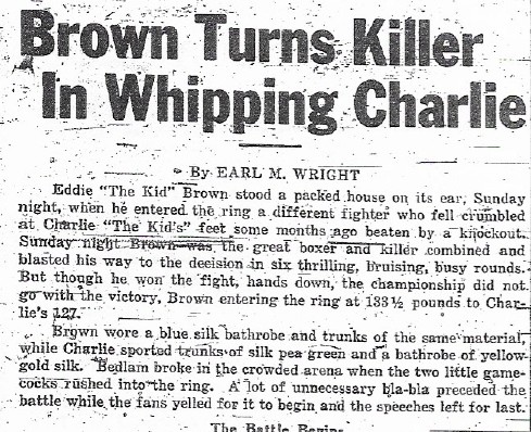 “A fight fan, obviously a lover of the ear-puffing racket, writes us concerning the verdict ‘donating’ (as he puts it), Jackie Moore, after taking a sound thrashing from Eddie ‘Kid’ Brown, Sunday evening at the San Jacinto Club Arena.