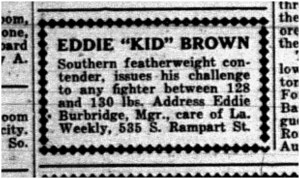 An advertisement in the Louisiana Weekly in 1932. Note that Weekly sports editor Eddie Burbridge is Brown’s manager.