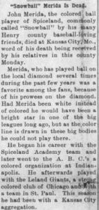 Merida is incredibly affable and unwaveringly friendly. After every game at Spiceland Academy, he would get mobbed by all the fans (especially the children), regardless if they won or lost. It was because of his friendliness he garnered his more famous nickname – “Snowball.” After his time was over at the Academy, he played for local semi-pro teams all over east central Indiana, sometimes still being the only black player on the team. Merida got his big break in 1907, when he was signed by the Indianapolis ABCs.