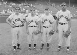 Luke Easter, far right, with his 1950 Cleveland Indians infield mates, from left, Al Rosen, Bobby Avila and Joe Gordon.