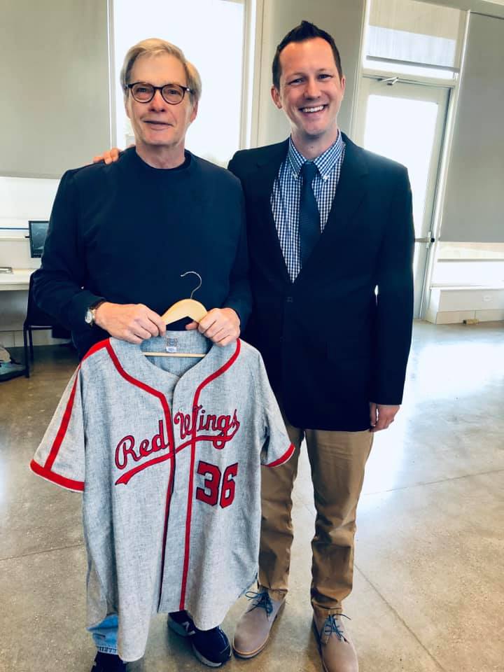 Alex Painter, right, with his friend, Randy Macpherson, another Luke Easter fan, at Luke Easter Day in Cleveland. Randy is holding a Rochester Red Wings Luke Easter jersey.