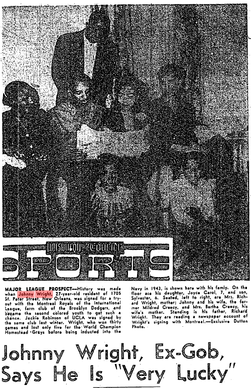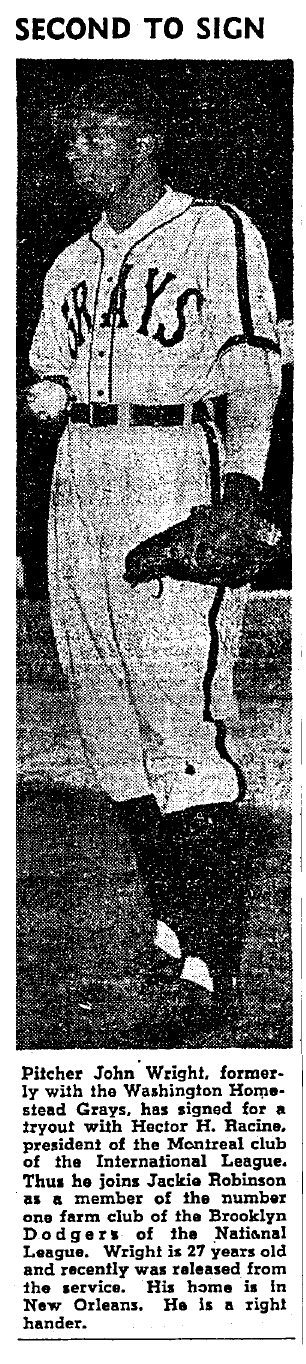 “Sports fans and citizens were elated to learn of the announcement last week by Hector Racine, president of the Montreal Royals Brooklyn Dodger farm team, that John Wright, 1705 St. Peter St., is the first native New Orleans Negro to be signed to play ball with a major league club.