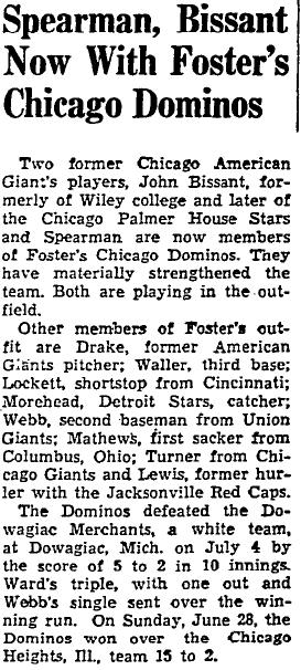 - Apparently defected briefly from the American Giants to suit up for an extremely short-lived, largely barnstorming semipro team, the Chicago Dominos (or Dominoes), in summer 1942. According to media reports, the club was owned by one Jimmy Foster, managed by Harlem Globetrotters impresario Abe Saperstein, and composed of guys who decided to work in factories in the wartime defense industry.