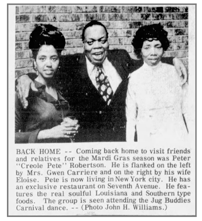 Pete’s cuisine digs gained some mention in Jet magazine in 1952, when the publication, under its “New York Beat” section, noted that Robertson “spent more than $20,000 in redecorating his House of Gumbo Cafe, then sent to his native New Orleans and imported a chef and ten creole [sic] beauties as waitresses. Five of them made over $150 in tips alone the first week.”