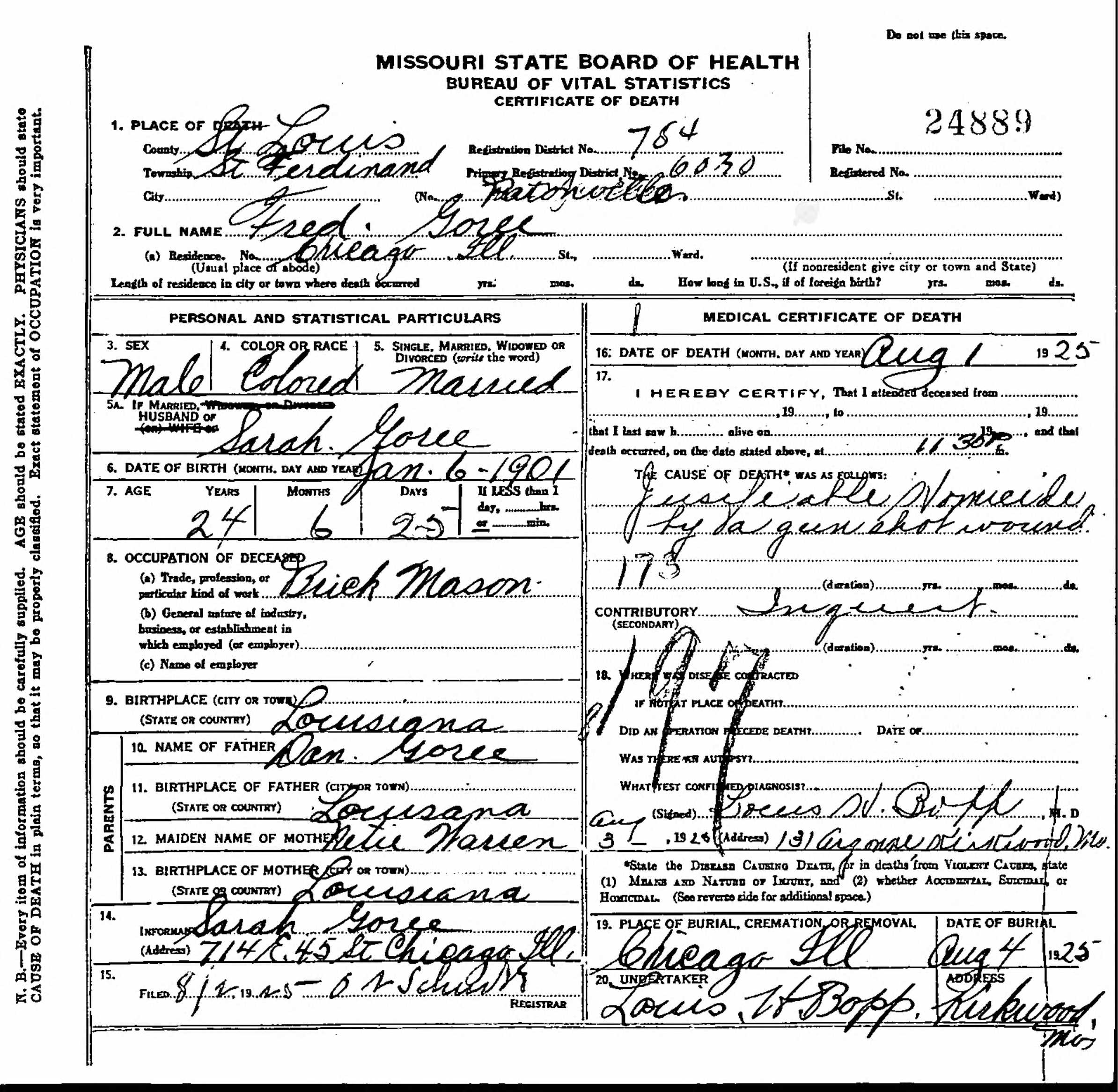 An example: I previously reported that Goree was about 24 and a half years old when he was killed, but that was inaccurate – he was actually 33. I based my first age estimate on his death certificate, which lists his date of birth as Jan. 6, 1901 when it was actually 1892. To make matters more confusing, his World War I draft card lists his DOB as Jan. 1, 1891.