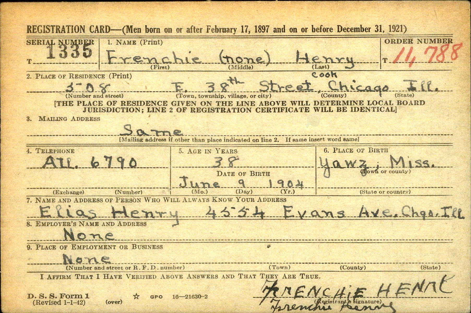 By 1940, Frenchie and Cora were back together and living on St. Lawrence Avenue in the Windy City, and by the time Frenchie Henry registered for the World War IIdraft in February 1942, he was living at 508 E. 38th St. His older brother, Elias Henry – and not, notably, Cora, his wife – was listed as the person who would always know Frenchie’s address.