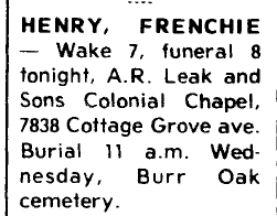 But what happened to Frenchie Henry himself? I couldn’t find much info at all about the latter years of his life, just that he died on Jan. 28, 1977, more than seven years before his wife. Unlike Cora Lee, Frenchie didn’t get much of a sendoff when he passed, just a standard, eight-line, block obituary in the Feb. 1, 1977, issue of the Defender.
