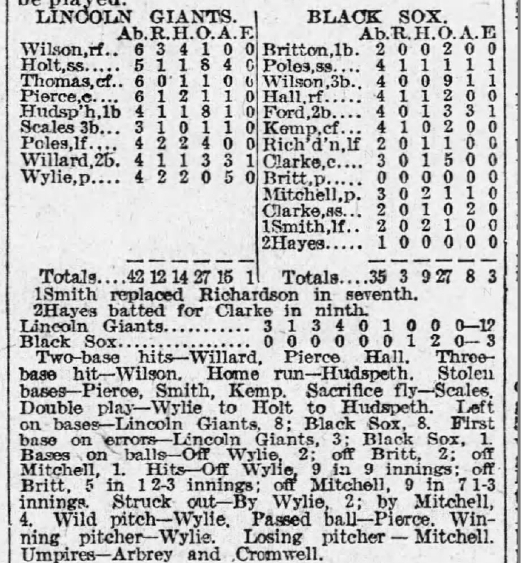 Here’s an example … in the Baltimore Sun’s Aug. 26, 1923, coverage of a clash between the Lincoln Giants and Black Sox (the former won, 12-3), the Baltimore section of the score listed a “Britton” leading off and playing first base for the Black Sox. However, “Britton” only had two at bats.