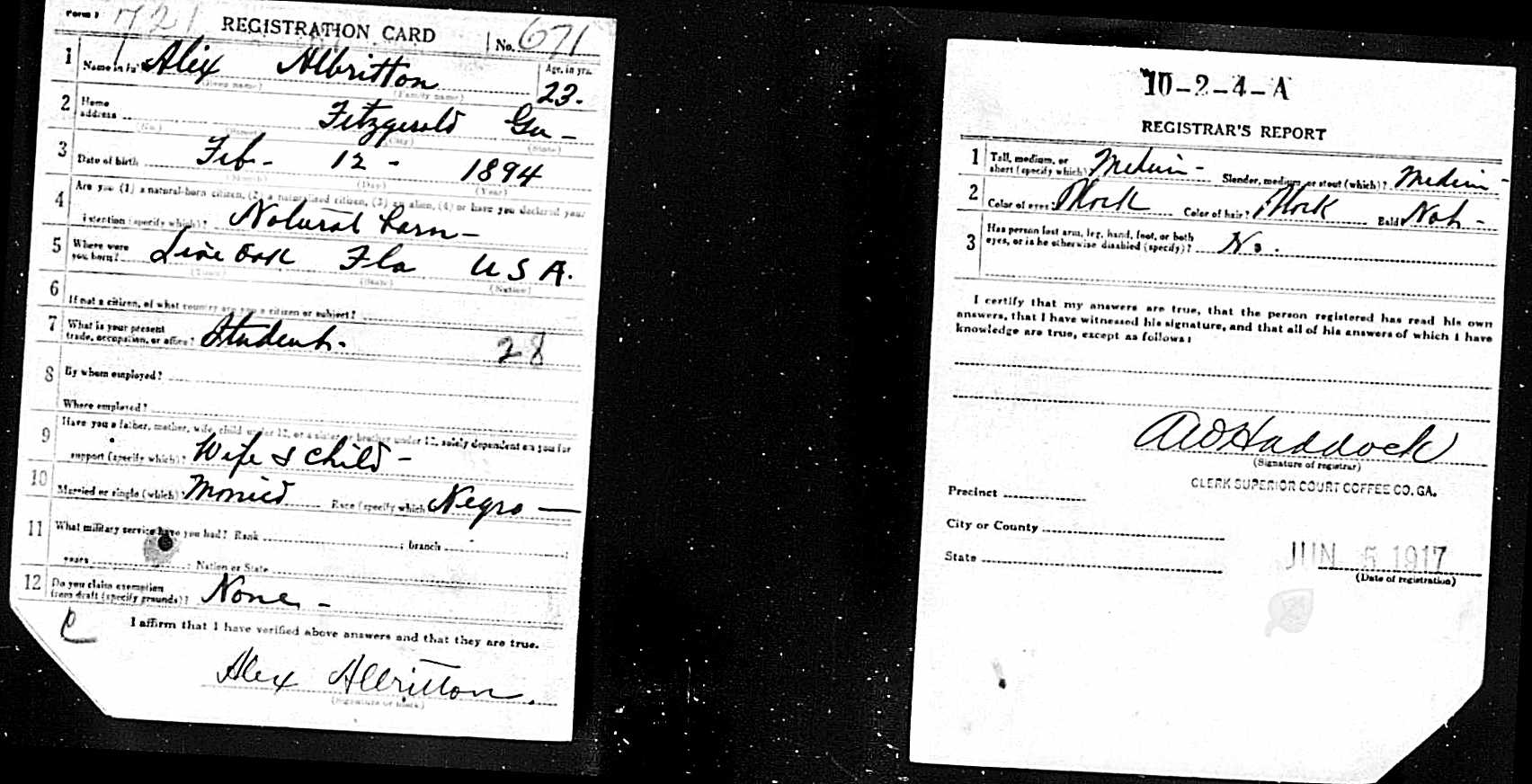 Alexander Albritton’s WWI draft card.