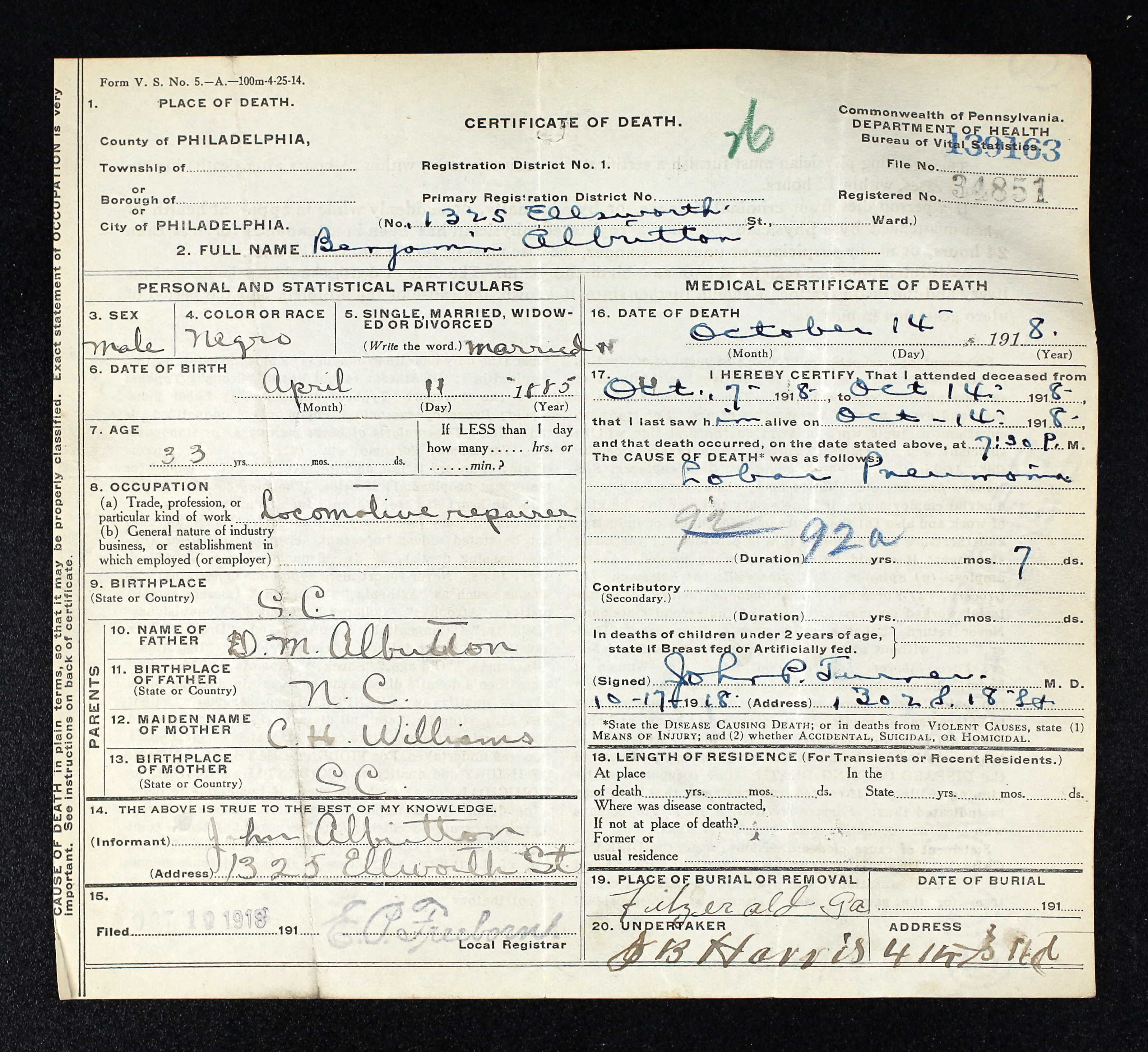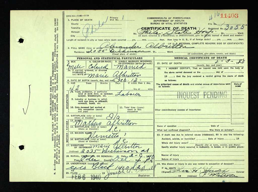 According to the Feb. 8, 1940, issue of the Philadelphia Tribune, Albritton’s wife, Marie, said he had been hospitalized “following a nervous breakdown” in January 1939, a little more than a year before his death in Byberry on Feb. 3, 1940, just nine days short of his Feb. 12 birthday. (The year of his birth varies; his World War I draft card gives it as 1894, while the 1900 Census states 1892. The 1910 Census indicates 1893, the 1930 Census asserts 1896, and his death certificate states that he was 42 when he died, indicating he was born in 1897.)