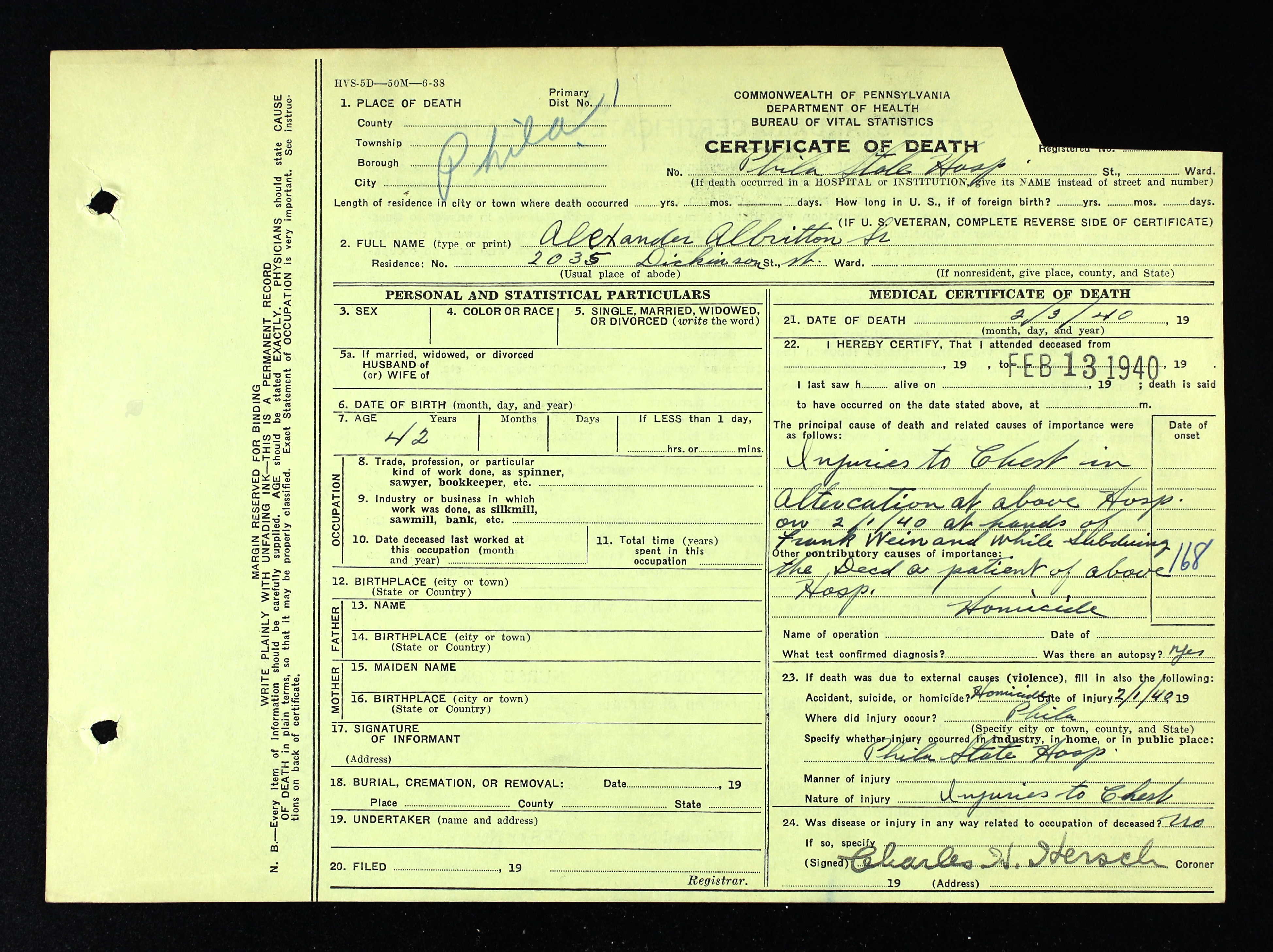 That reflective dissonance could be because the extent of Albritton’s actual injuries remain a little unclear, just as they were 85-plus years ago. His death certificate states that he died from “[i]njuries to chest in altercation at above hosp. on 2/1/40 at hands of Frank Weinand while subduing the dec’d a patient of above hospital.”